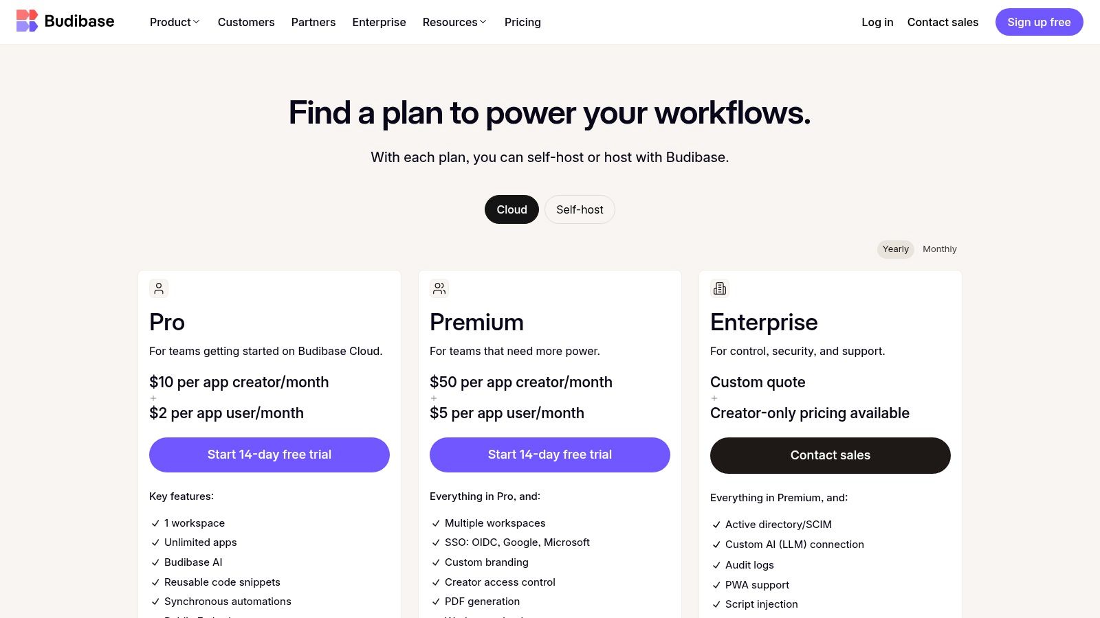 Budibase offers a compelling pricing model that is transparent and scales predictably. The open-source, self-hosted option is free for up to 20 users, making it exceptionally accessible. Paid plans are divided into Cloud and Enterprise offerings, with pricing based on the number of "Creators" (developers) and "End Users," which is often more cost-effective than per-user models. Plans start with a generous free tier, with paid options adding more user capacity, user groups, and advanced features.