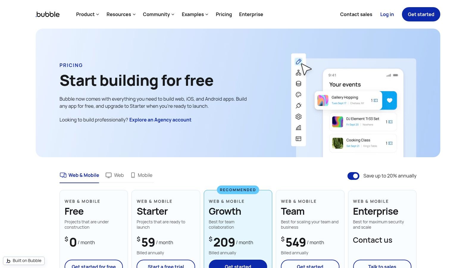 Bubble offers a generous free plan for learning and building, but launching a live app requires a paid subscription. The pricing tiers are based on "workload units," a metric that measures server usage like database operations and workflows. Plans start at $29 per month (billed annually) and increase based on the workload capacity and features like dedicated server instances and the number of app editors.